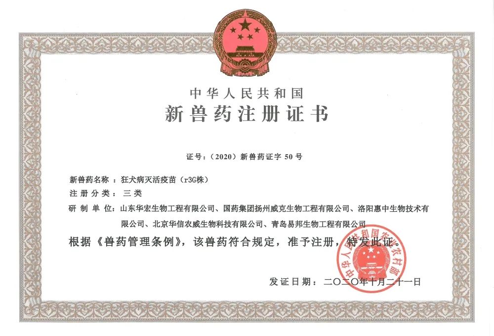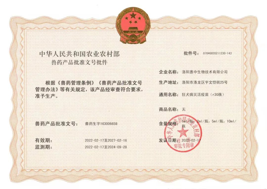 喜報|惠中生物狂犬病滅活疫苗(r3G 株)取得《中華人民共和國農(nóng)業(yè)農(nóng)村部獸藥產(chǎn)品批準文號批件》
