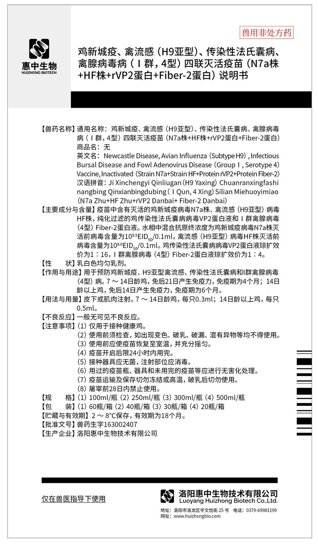 雞新城疫、禽流感(H9亞型)、傳染性法氏囊病、禽腺病毒病(1群,4型)四聯(lián)滅活疫苗(N7a株+HF株+rVP2蛋白+Fiber-2蛋白)